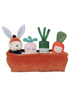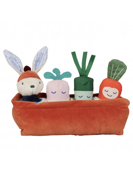 Le potager d' activités de Gabin lapin. Un premier jeu de manipulation et jouet d’éveil sensoriel et poétique, imaginé pour accompagner les bébés dans leurs premières découvertes. un Jouet d'activités avec Gabin lapin et des petits legumes avec grelot, Pouet, et papier bruissant. pour les petits jardiniers en herbe.
