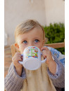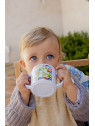 Voici le Mug Peace & Love avec son couvercle Orange très 70’.2 décors imprimés : _ D’un côté la bande des copains qui vont à la ville en 2 Chevaux De l’autre le sigle Peace & Love emblème de la "Happy Farm".